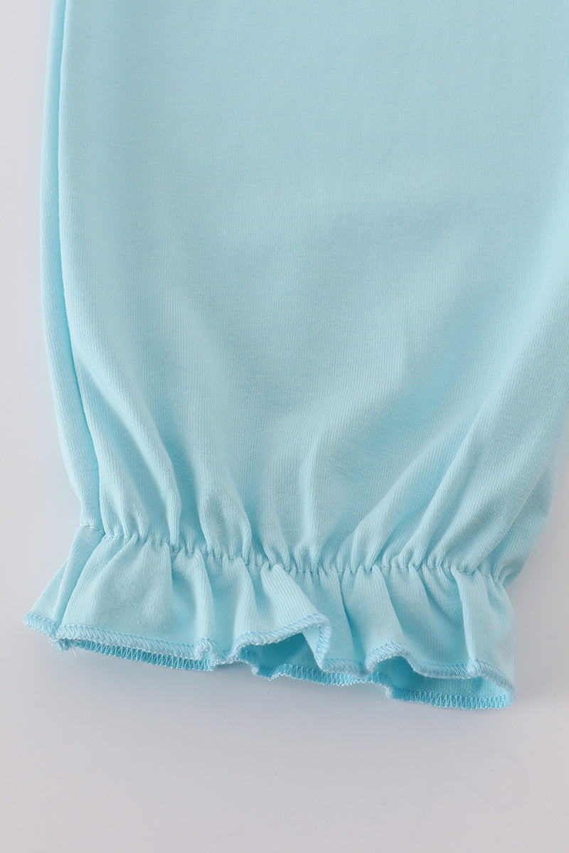 Add a touch of whimsy to your wardrobe with this playful blue bow and lace print ruffle pants set. Featuring delicate lace details and charming ruffles, this set combines comfort with a fun, flirty style perfect for brightening any day.