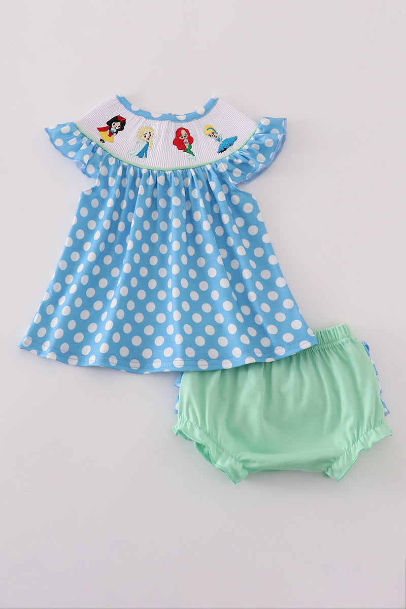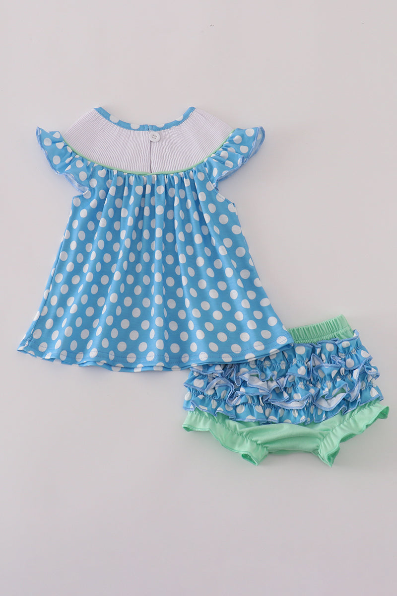 This playful smocked bloomer set features charming blue dot character embroidery, adding a touch of whimsy to your little one’s wardrobe. Soft and comfortable, it’s perfect for everyday adventures and keeps your child looking cute and cozy all day long.