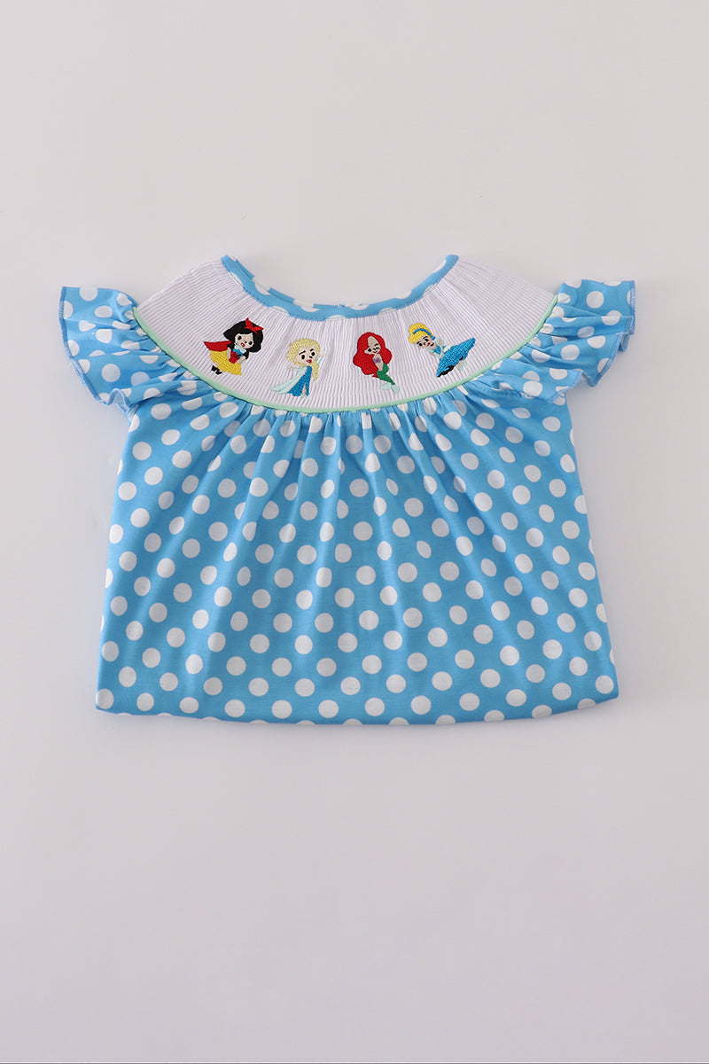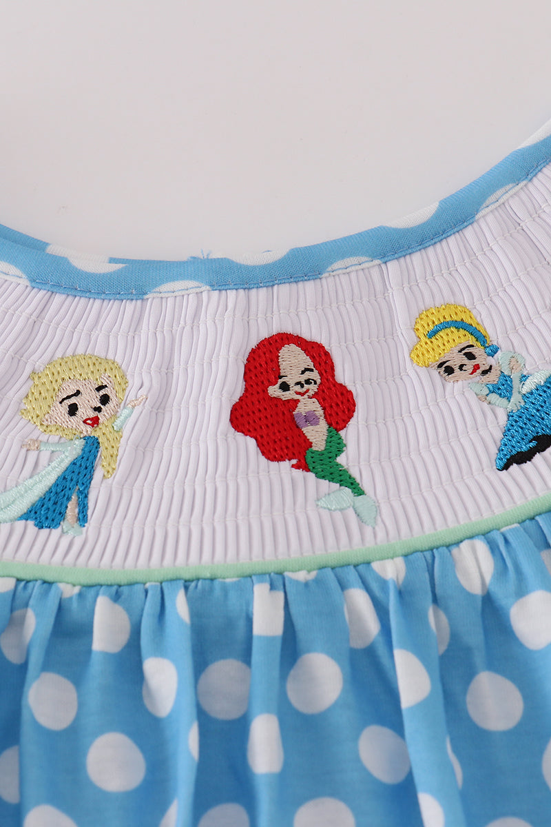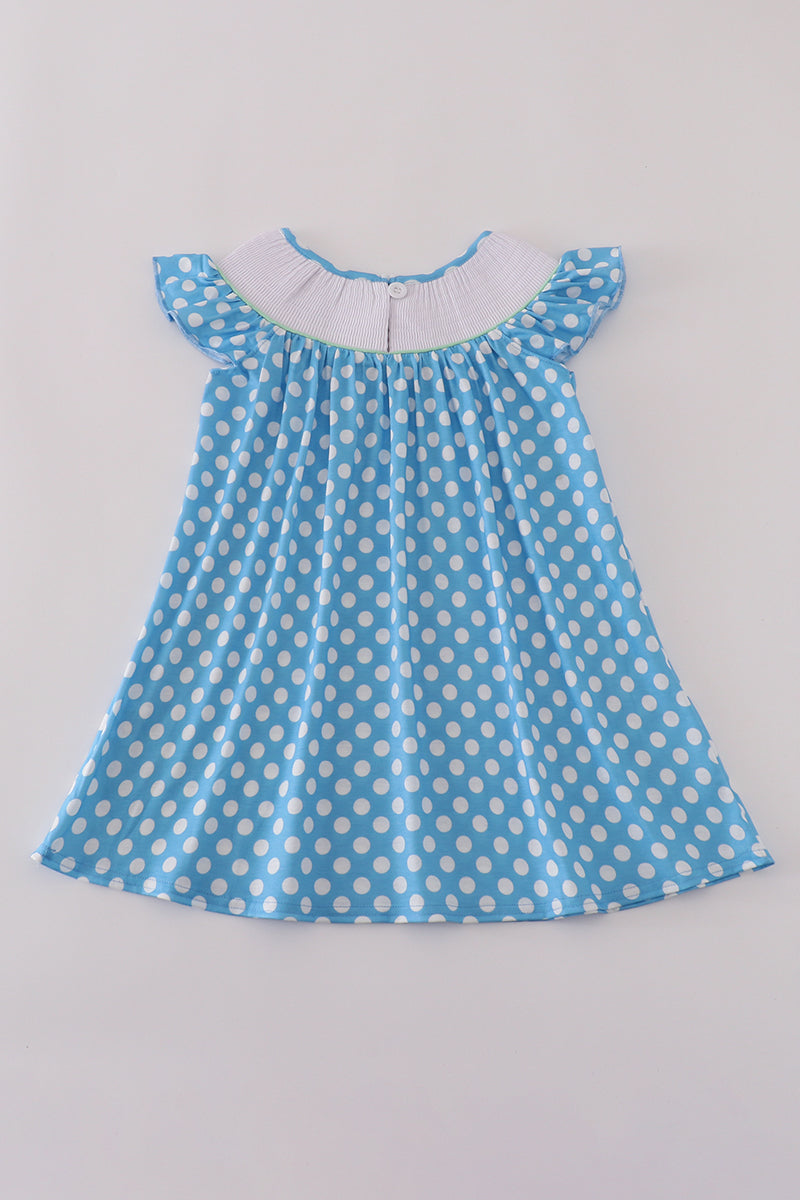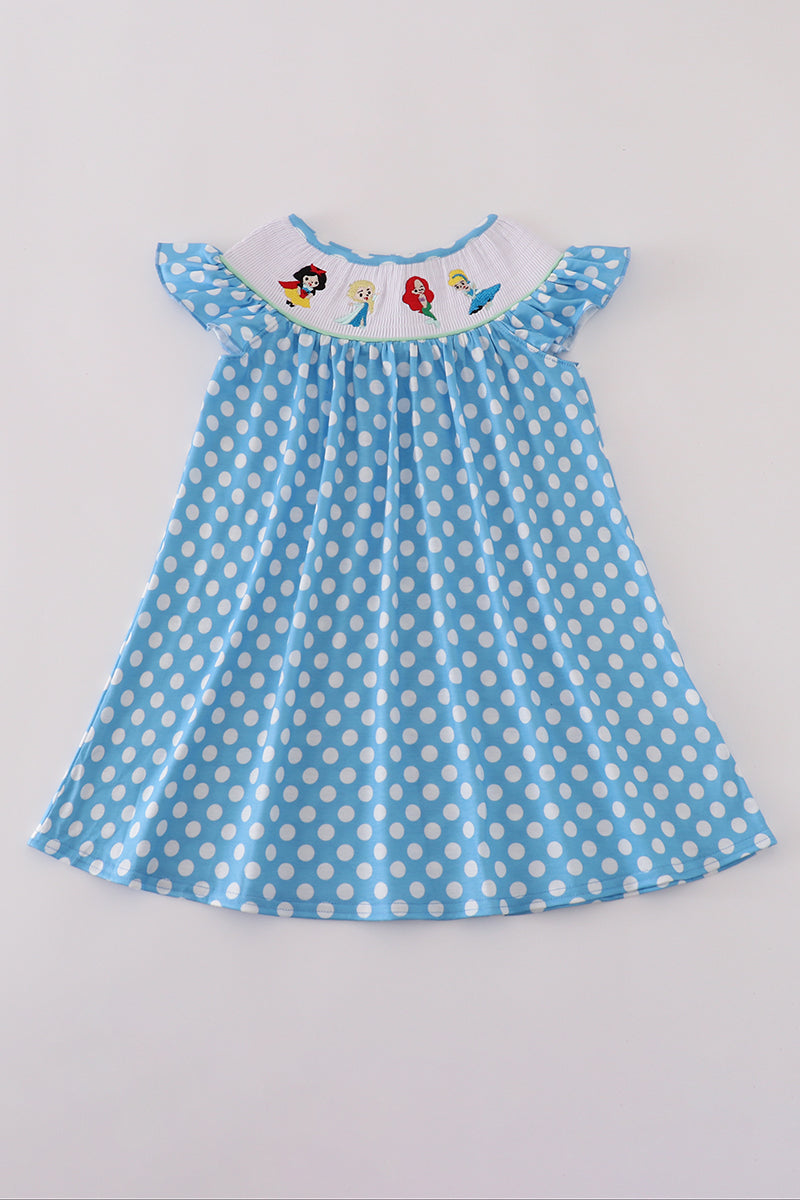 Blue dot character embroidery smocked dress