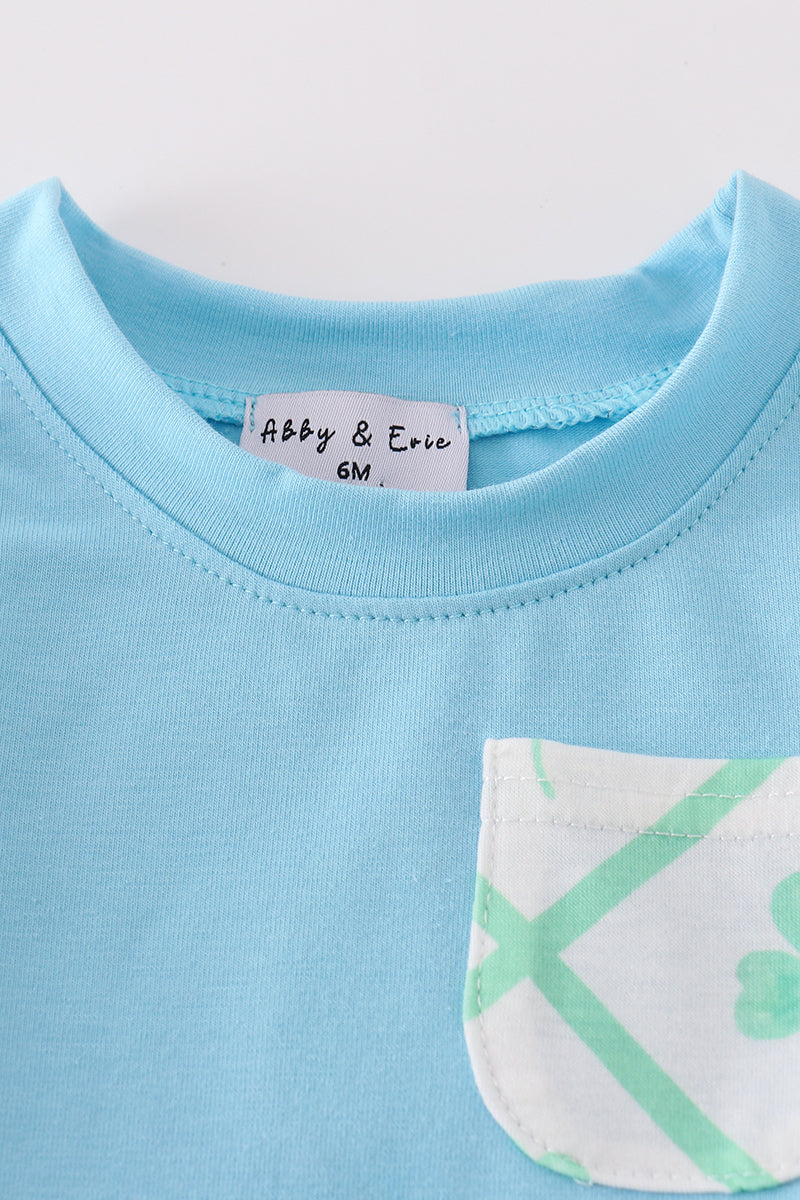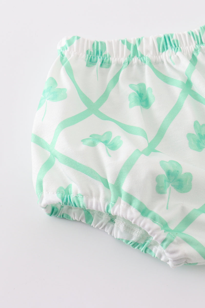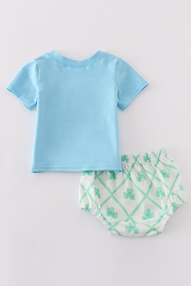 Get your little man ready to celebrate with this playful Blue St.Patricks clover boy bloomer set! With a festive clover pattern and comfortable design, he'll be the life of the party. Perfect for St.Patrick's day or any day, this set will make him stand out (and stay comfy) in style. Luck never looked so cute!