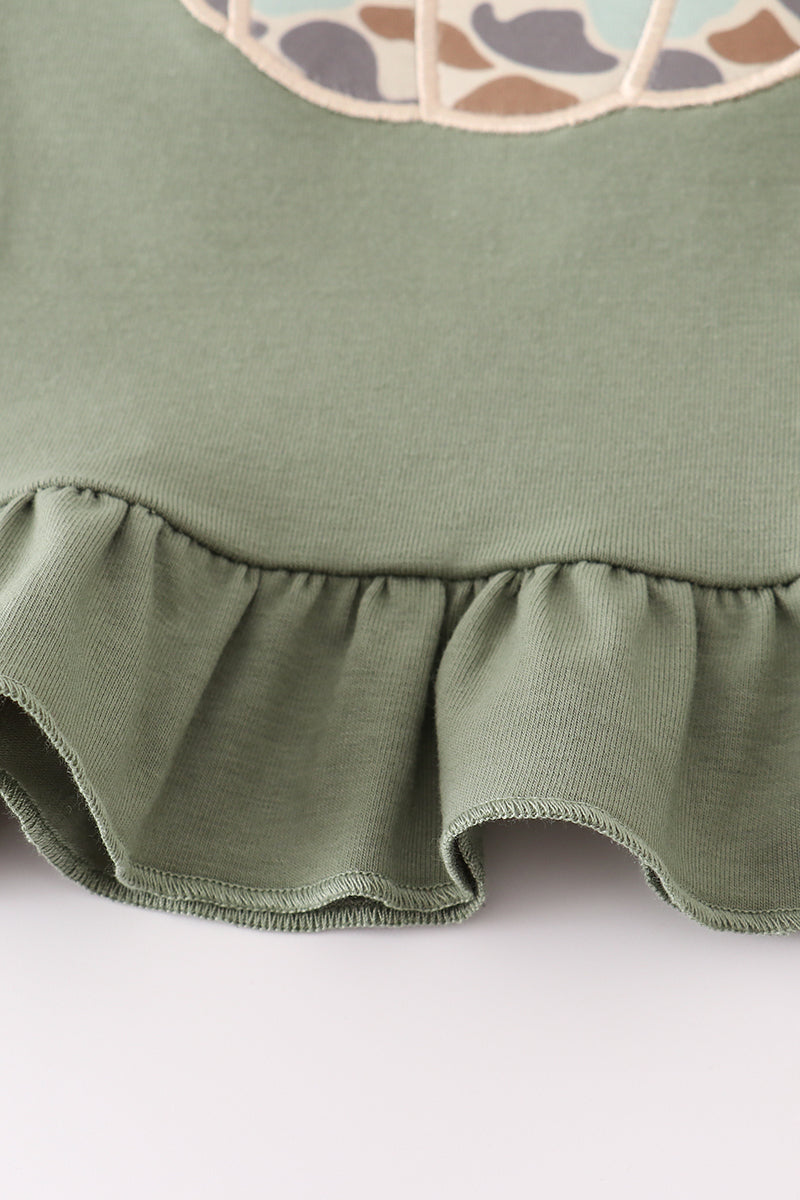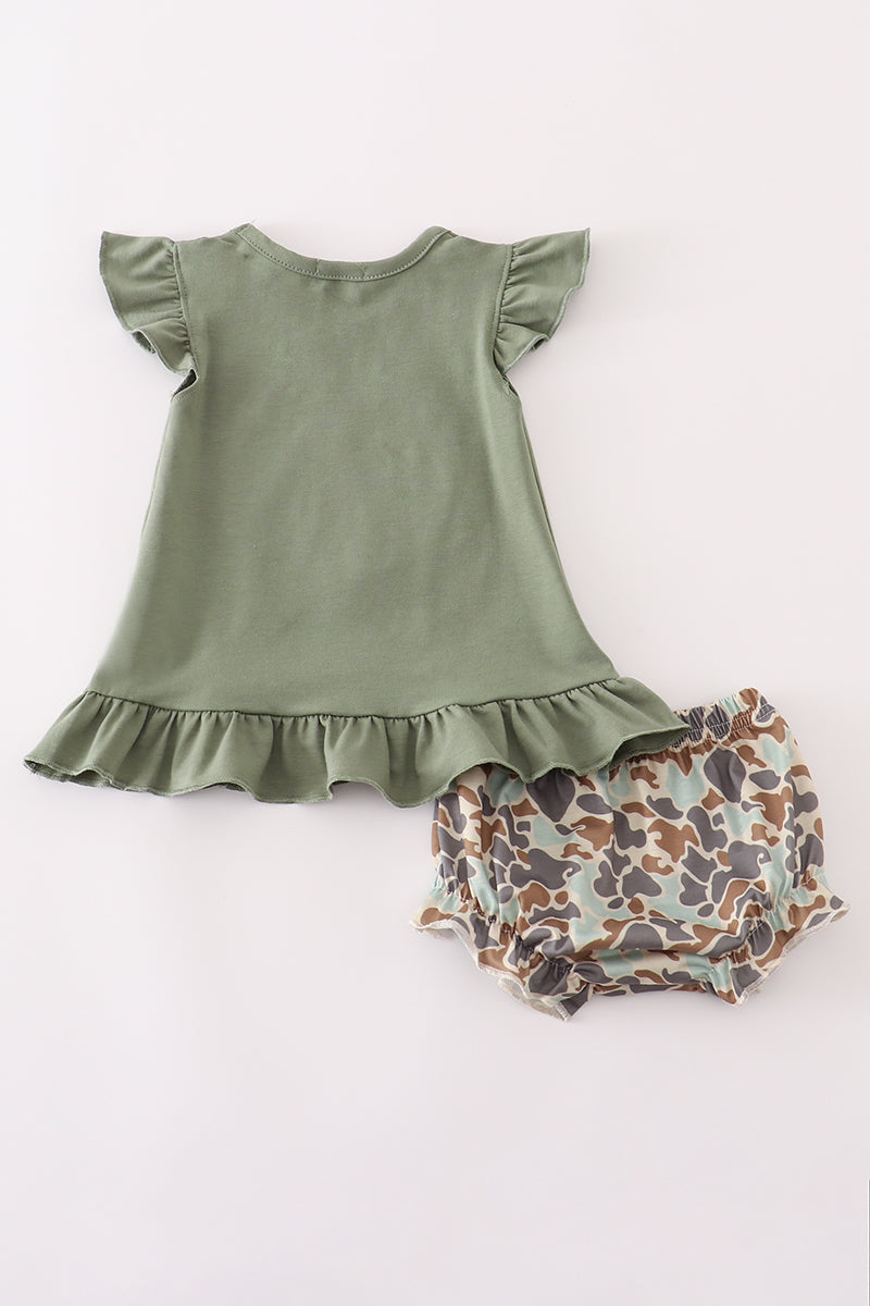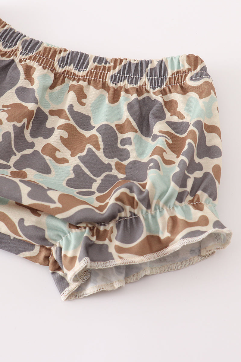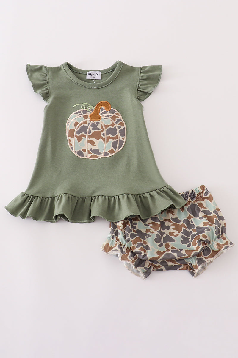 This adorable camouflage print bloomer set features a charming pumpkin applique and playful ruffle details, perfect for adding a fun, festive touch to your little one’s wardrobe. Soft and comfy, it’s ideal for everyday adventures or seasonal celebrations.