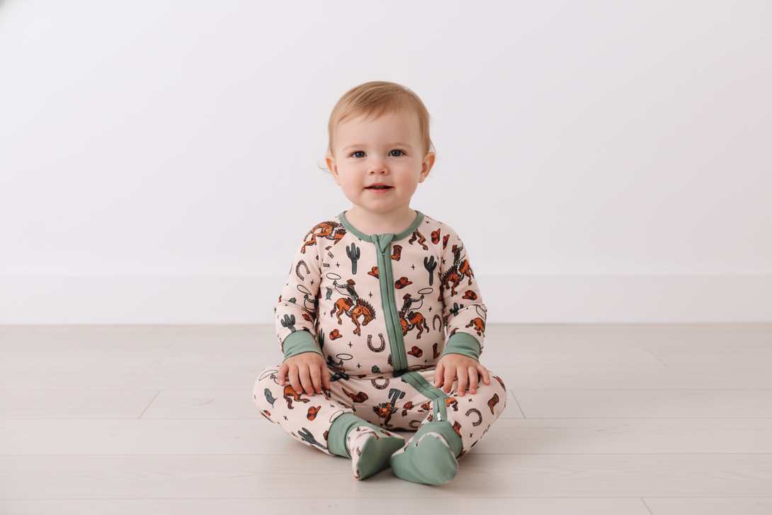 Step into summer fun with this green cowboy bamboo romper! Featuring a handy zipper for easy wear and made from soft, breathable bamboo fabric, it keeps little adventurers cool and comfy. Its playful cowboy-inspired design adds a touch of wild west charm to any day of play. Perfect for sunny days and spirited outings!
