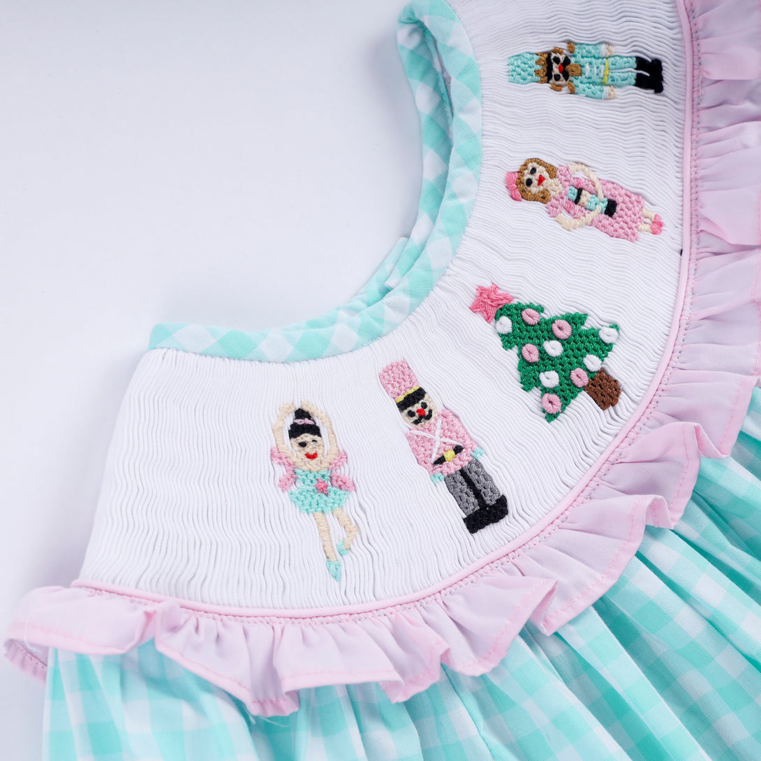 Deck the halls in festive style with this charming mint Christmas nutcracker set! Hand-smocked details add artisanal charm to soft gingham fabric, while delicate ruffle pants bring playful movement to every twirl and dance. Perfect for holiday photos, family gatherings, or spreading seasonal cheer. This whimsical two-piece combines timeless nutcracker imagery with modern comfort, making it an instant favorite for little ones who love the magic of Christmas.