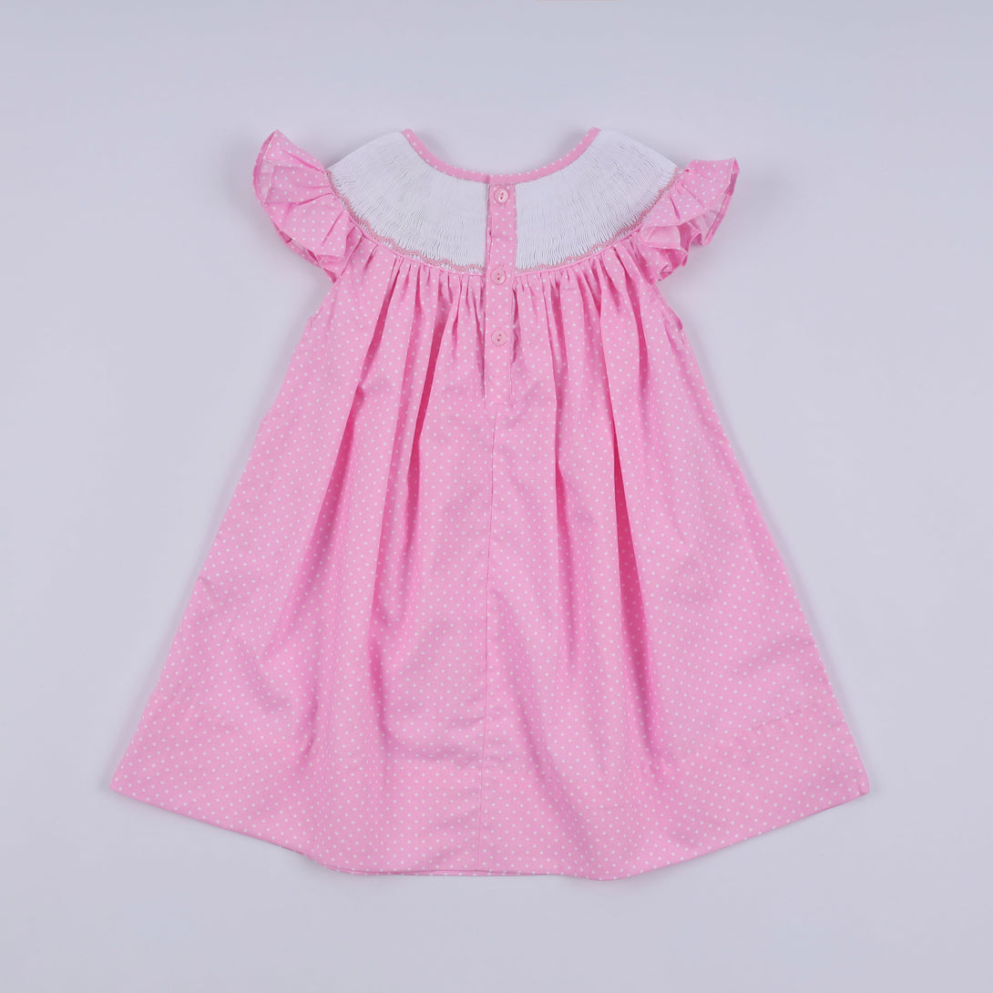Twirl into adorable style with this charming pink dress! Featuring delicate hand-smocked detailing and sweet polka dots, it's perfect for little ones who love to play and pose. The ruffled hem adds extra flair and movement, making every moment feel special. Soft, comfortable, and oh-so-cute—this dress is ready for playdates, parties, or just being fabulous all day long!