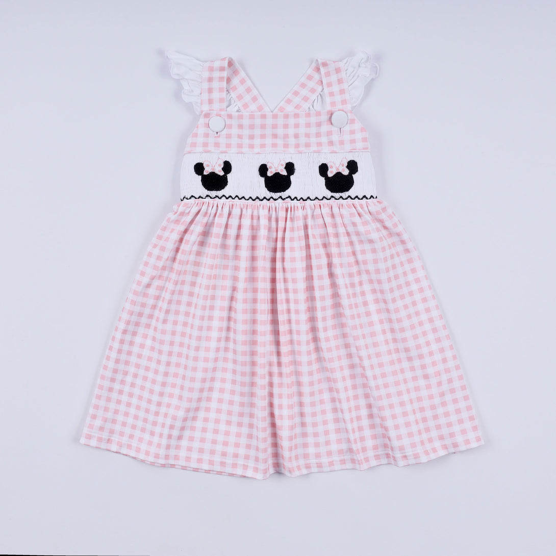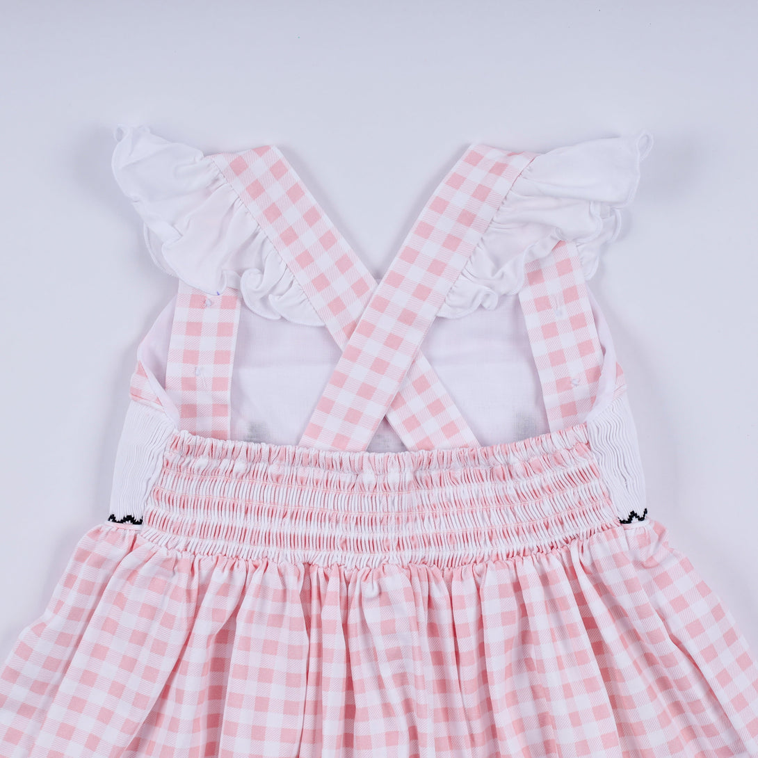Pink character hand smocked gingham ruffle dress