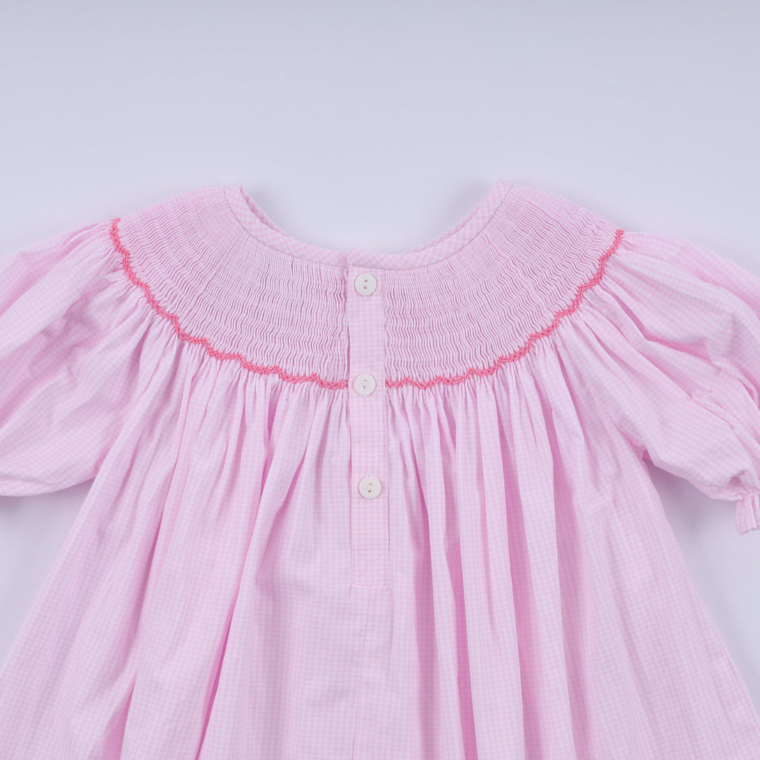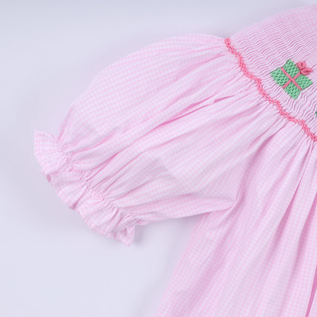 Twirl into the season in this delightful pink dress featuring an adorable hand-smocked Christmas tree design. Perfect for holiday photos and festive celebrations, this charming piece combines comfort with festive flair. The intricate smocking detail adds texture and visual interest, while the soft pink hue keeps things sweet and modern. An instant favorite for little ones who love the magic of Christmas!