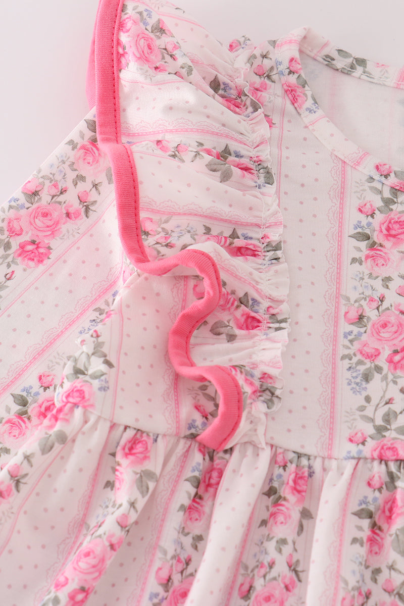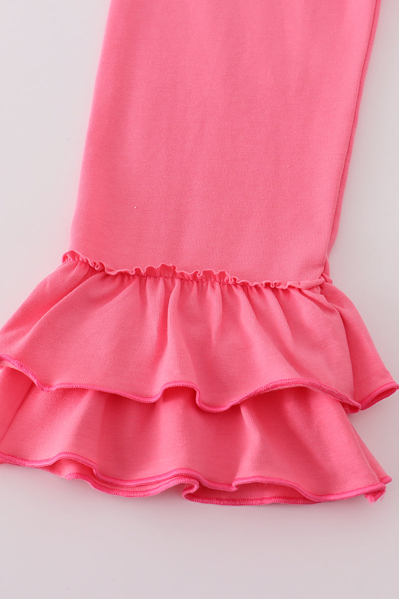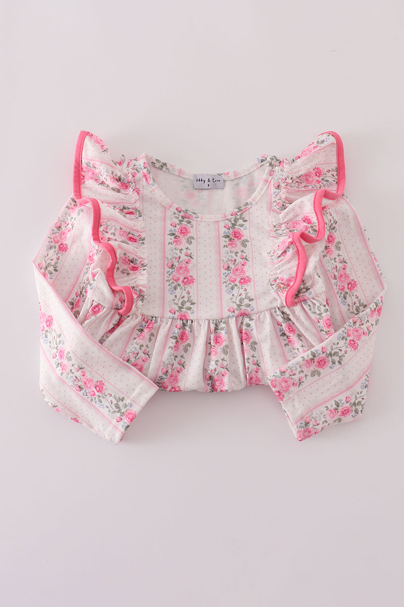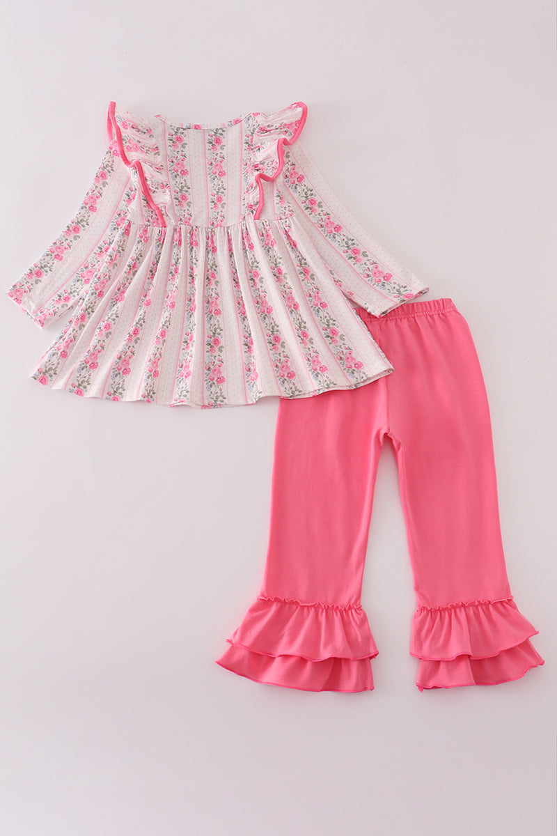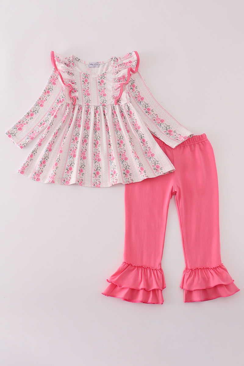 Step into a garden of fun with this pink floral print ruffle pants set. The lively floral pattern and playful ruffles add a flirty touch, perfect for brightening up any day. Comfortable and stylish, this set lets you move freely while turning heads wherever you go. Embrace your cheerful side with this charming outfit!