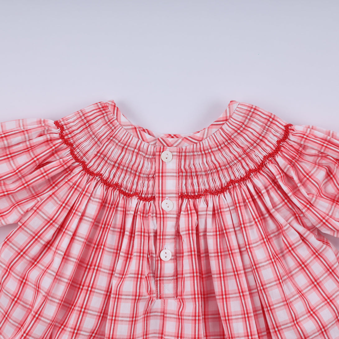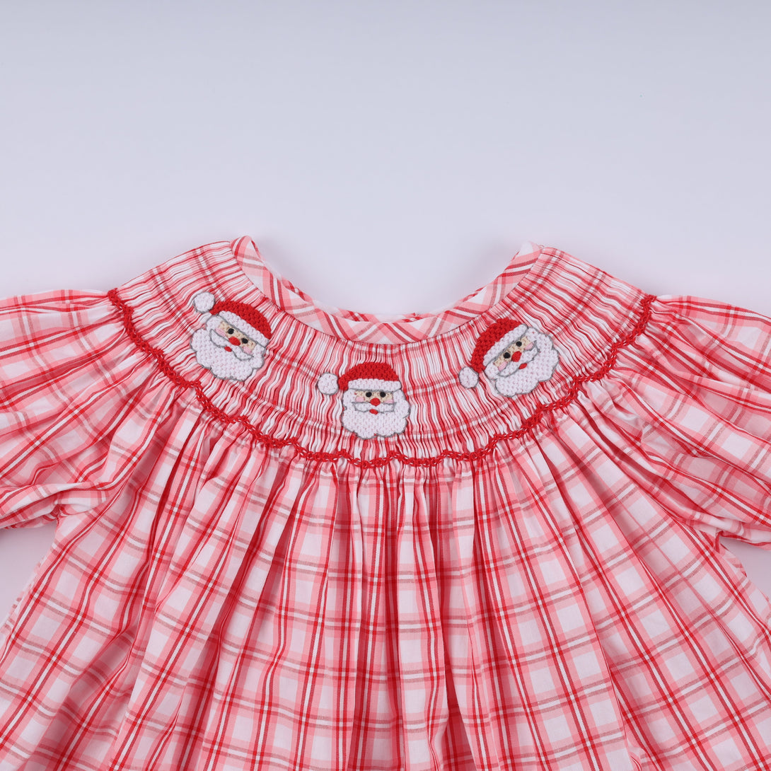 Dress your little one in holiday magic with this charming red plaid bloomer set featuring festive Santa Claus details. Hand-smocked craftsmanship adds texture and whimsy to the classic design, while the comfortable bloomer silhouette keeps kids moving freely through all their Christmas adventures. Perfect for holiday photos, family gatherings, or spreading seasonal cheer wherever they go. A delightful choice for parents who love timeless, playful holiday style.